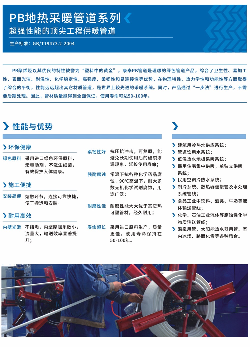 從結構上來看,聚丁烯(PB) 是一種線性的半結晶性熱塑性材料,是一種高分子惰性聚合物,是世界上最先進的化學材料之一。加工和使用過程中無毒無污染,可以反復加熱成型。聚丁烯(PB)綜合了衛(wèi)生性、加工性、表面光潔度、耐溫性、化學穩(wěn)定性、強度、柔韌性和易連接性等優(yōu)勢,在物理特性、熱力學特性和功能性等方面取得了綜合的平衡,從而賦予了PB地熱采暖管管材諸多得天獨厚的特質,能夠用于流體輸送系統(tǒng),尤其在建筑內的熱水輸送系統(tǒng)領域開辟了廣闊的用武之地,PB管道是世界上較先進的采暖系統(tǒng),他的優(yōu)良特性被越來越多的人關注,被譽為“塑料中的黃金”。 聚丁烯(PB)管材是目前較理想的地板采暖管材和冷熱水管材,其性能遠遠超出其它管材的,我公司生產的新型PB地板采暖管,采用PB專用料生產,因此材質是十分可靠的。PB管道的生產,實現(xiàn)了真正的“一步法”,它不需要后期處理,因此,管材質量能得到全面保證,使用壽命可達50年-100年。